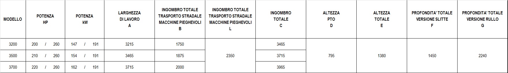 | MODEL | POWER HP | POWER kW | WORKING WIDTH mm | TOTAL FOOTPRINT mm | NO. BITS** | WORKING DEPTH ON ROCK cm* | WORKING DEPTH IN SOIL cm* | ROTOR rpm | WEIGHT* kg |